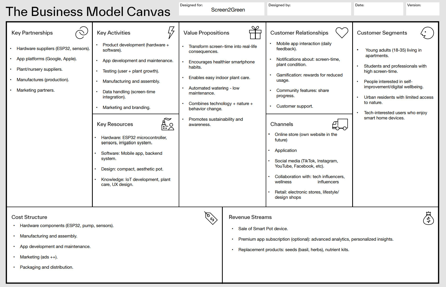 Be easy to set up and maintain for non-technical users. Provide clear behavioral feedback via the plant and mobile app. Be aesthetically suitable for indoor spaces (apartments, offices). Encourage responsible smartphone usage without causing stress. Constraints Operate within budget limitations (Yet to be defined)(affordable and accessible components). Be feasible to develop within the project timeline. Allow future upgrades or expansions (e.g., sensors or hydroponics refinements). Ensure electrical and water safety in the design.